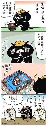 黒猫クインシーの幼少期、夏休みのラジオ体操初日。ラジオ体操出席カードを紛失し、それにかわる厚紙を探していた所、当時からデザイン的に気にいっていた蚊取り線香の箱が目に入り、切り抜いて代用したそうです。その年のラジオ体操は、ひとりだけオシャレ…