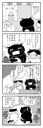 今日は黒猫クインシーが、ネットの記事で、「カフェに複数人で来店した際に、なにも注文しない人がいる」というのを読んでおどろいていたので、備忘録的にマンガに描いてみました。そういえばこの間、黒猫とパン屋さんのイートインコーナーでお茶していた時…