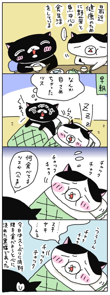 「まさか寝言でスキヤキって言うとは思わなかったッス…(このマンガは、恥ずかしながら実話なのです)」by黒猫クインシー